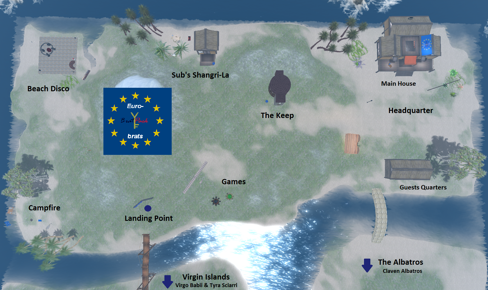 The layout of Eurobrat Headquarter Island is shown in the orientation map below. It is the same map that you’ll see upon your arrival on our island. A teleporter system provides quick traveling (by the way a transportation system like this could solve a lot of problems in RL *grins). Or , even better, explore on foot. The main spots to visit are: Campfire, Beach disco, Sub’s Shangri-La, Headquarters, the “Keep”, the games and our Hotel CA (still located in a skybox). You’re invited to explore on your own but be aware of traps.