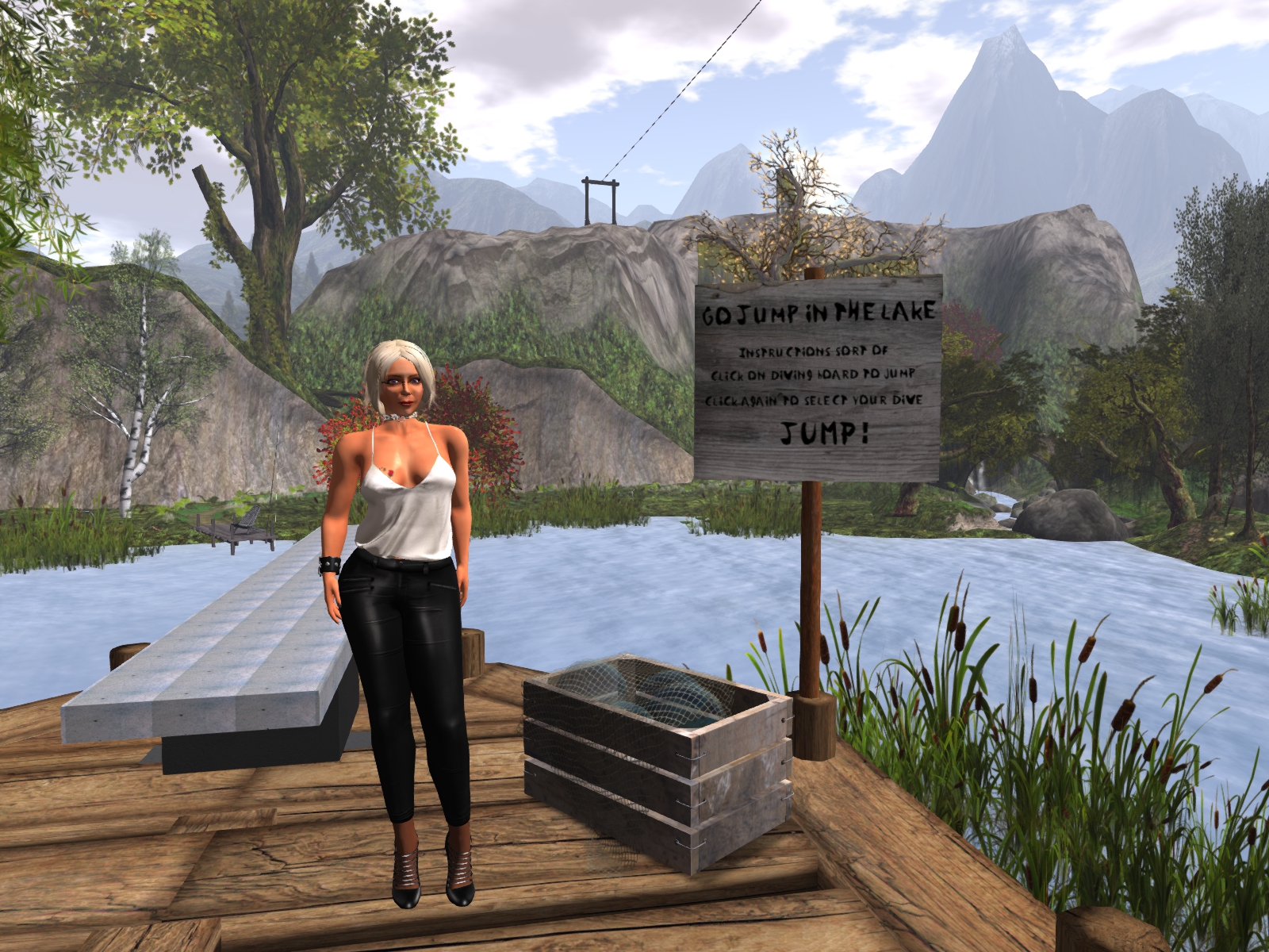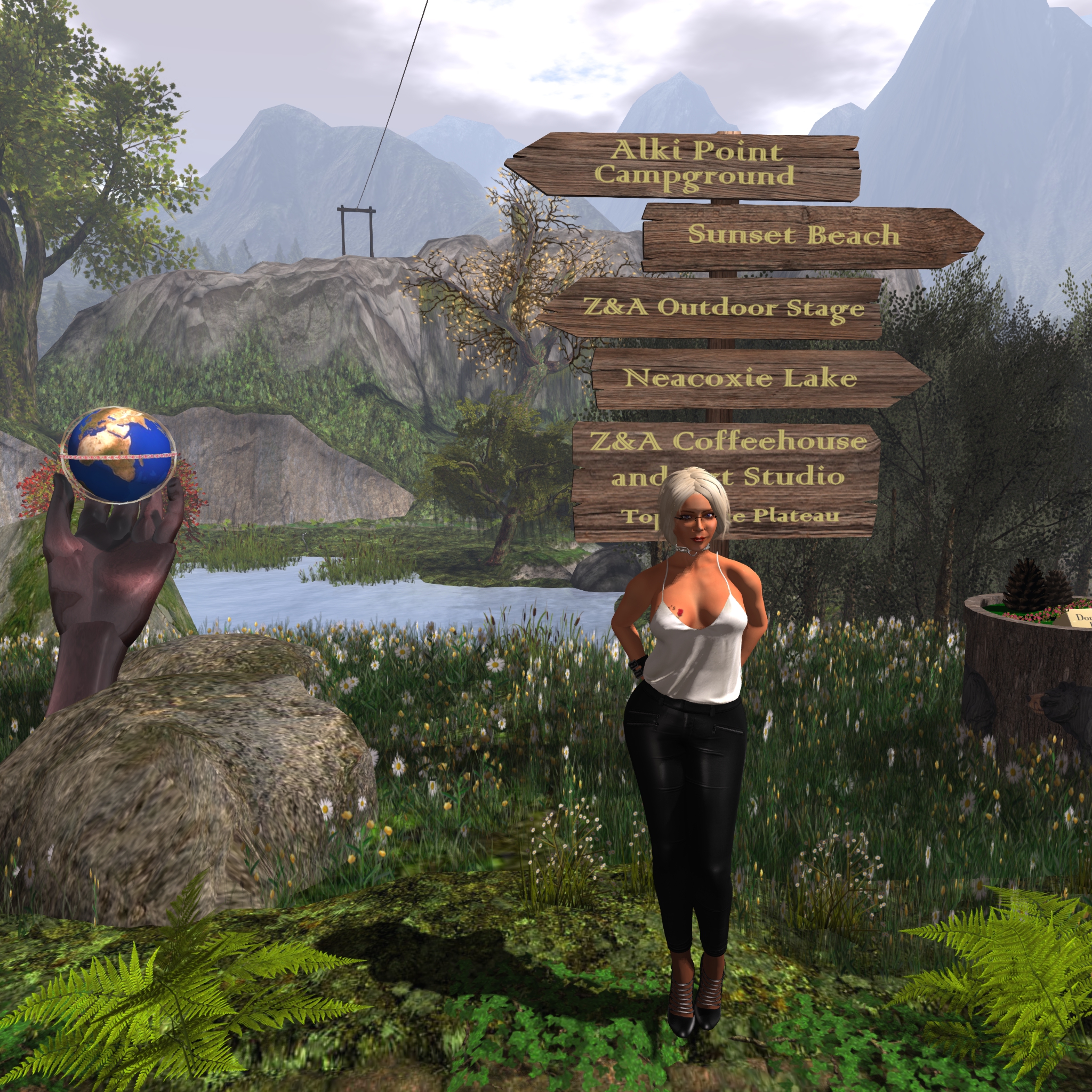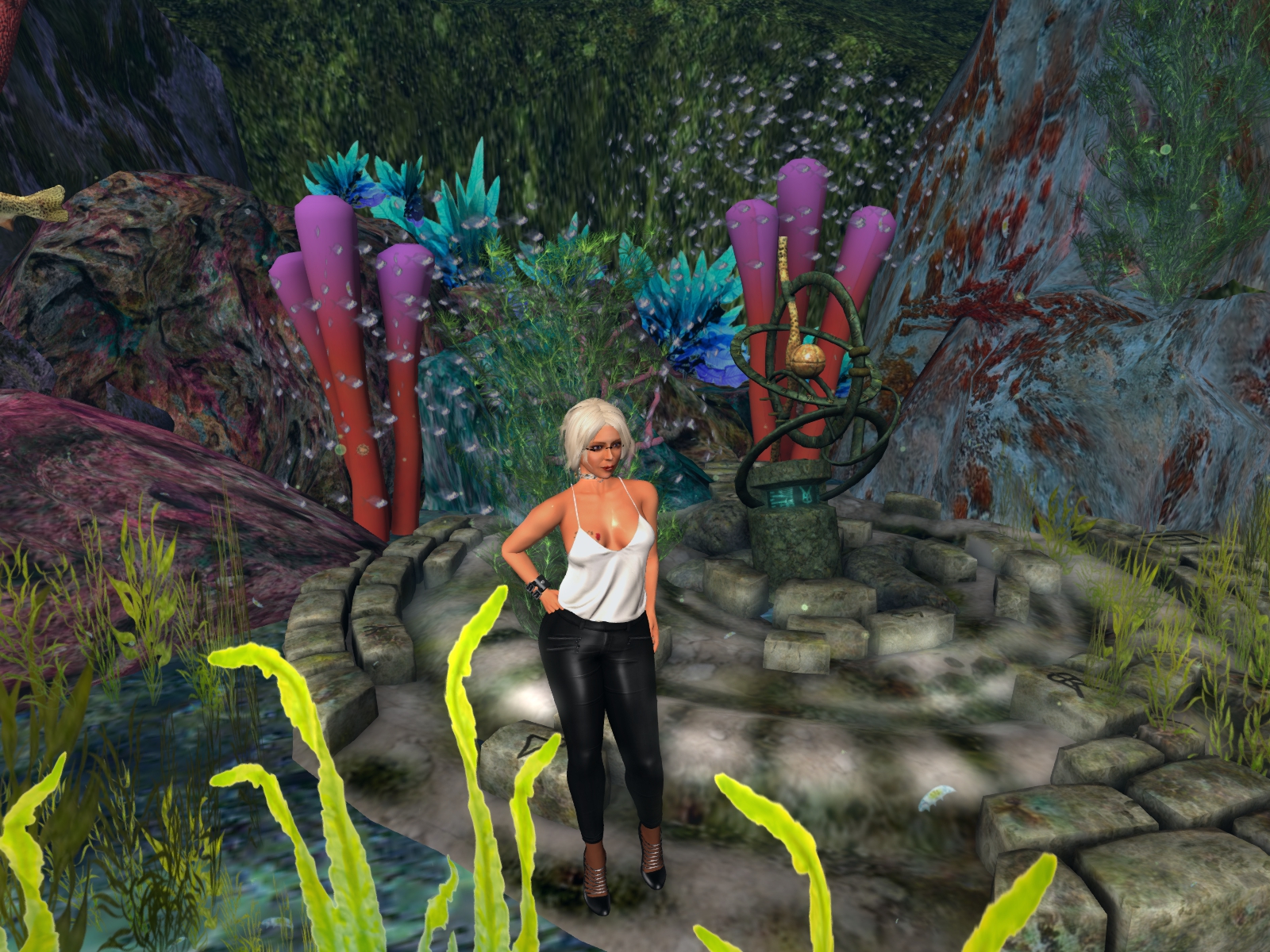 When you arrive at Alki you land at a sign post directing you to the different activities. I first went up to the coffeehouse and the art studio on the high plateau. The coffeehouse seems to be more a place to dance at night than to have just a coffee. The art studio is for sure a great place to display art. But up there you’ll find also other activities, like a visit to the underwater garden, a balloon ride or using the zip lane to go down again. I personally like the animation for your way down to the underwater garden. Well, I admit I should have changed to a swim suit but I was too lazy. Fortunately in Second Life you can go diving fully dressed and in high heels – and you don’t get wet.