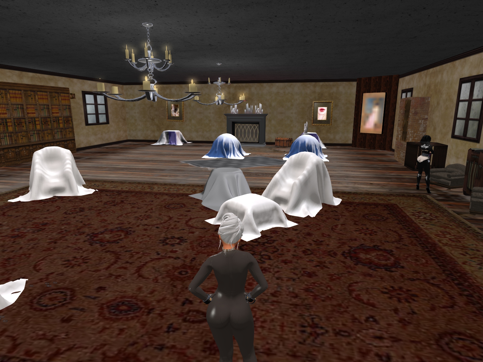 The main time of our visit we spend in a big room with covered furniture and many books and a Libririan, who spanked our slave cecy (no picture of that unfortunately). You might imagine that she was very excited about this spanking and left some juices on the floor of the room. Anyway, somehow we got out of the room and came back to the ground level where we assumed to be close to the gold. Kitty arrived that moment and I got trapped …..