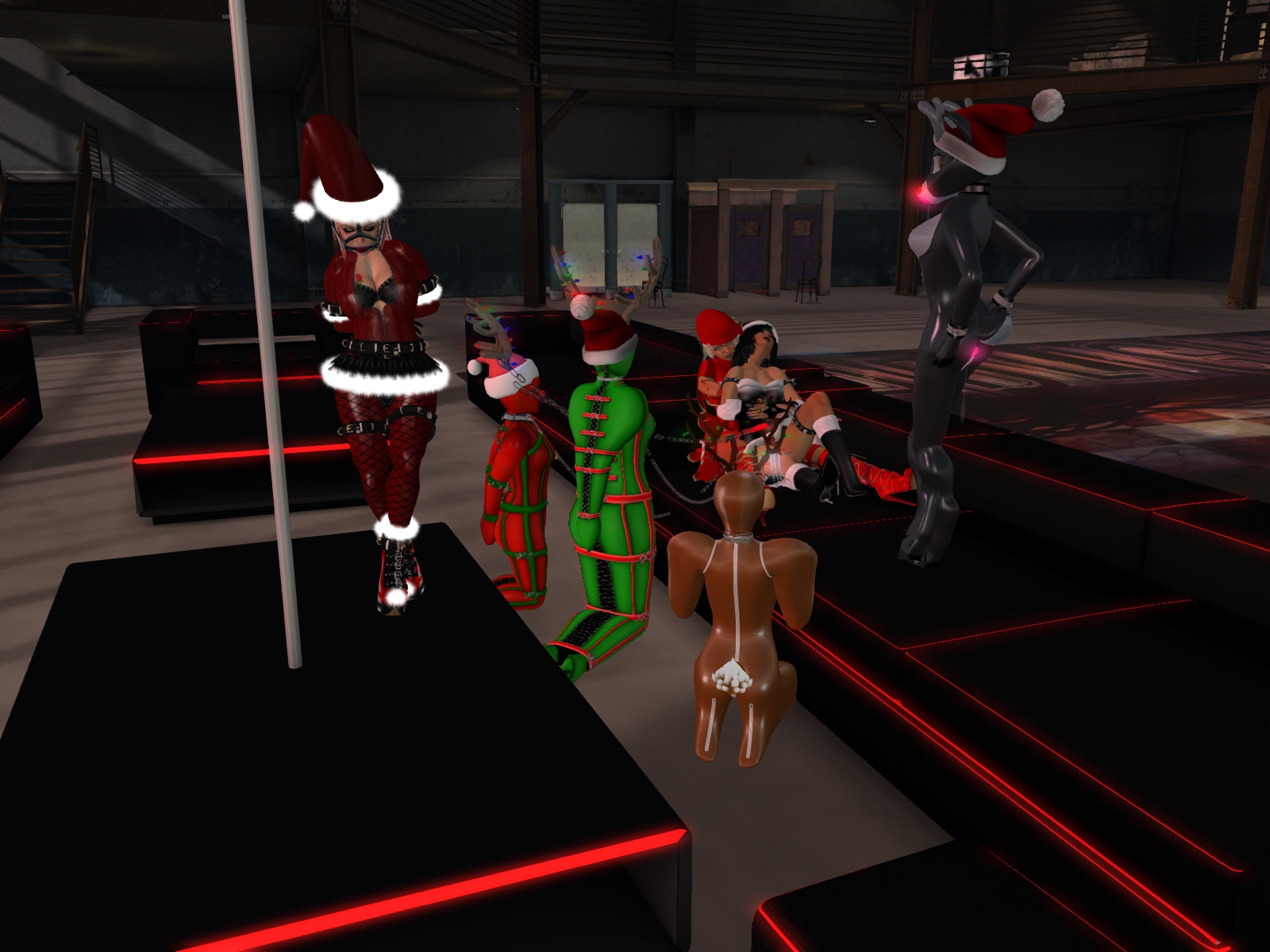 Then we moved to HeAdLiGhTs, a sim that we discovered just lately (I think it is quite new). It wasn’t full either there but we got into a nice conversation about upcoming events and I proposed to spread seasonal spirit with our slaves for 2k Linden per hour. To my surprise my offer was taken seriously (I was jsut kidding!) and I had to explain that we don’t sell our appearance. I admit that it makes me pretty proud about the work and effort Mistress Jenny, the slaves and I put into our outfits. And they do appear great when we’re many like that night. I had a nice chat, while Slavin C danced for us and the other slaves were pretty silent as they’re all gagged (as it should be).