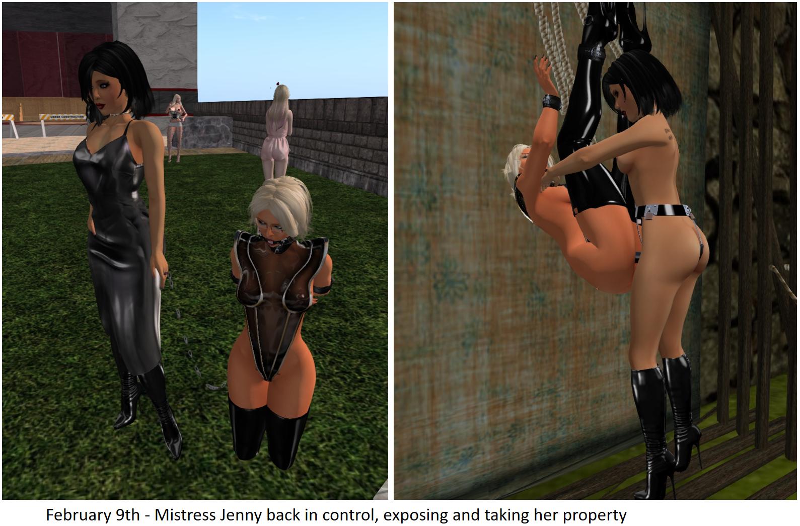 Thursday, February 9th, I met Mistress Jenny in the late afternoon. She finished my time being on par with her and took control very determined and quick. I had to wear the full vixen cuff set and she went shopping with me and bought a transparent body just barely covering me. Then she first took me to Heavy Bondage Club to expose me, then somewhere else where she took me with her strapon.
