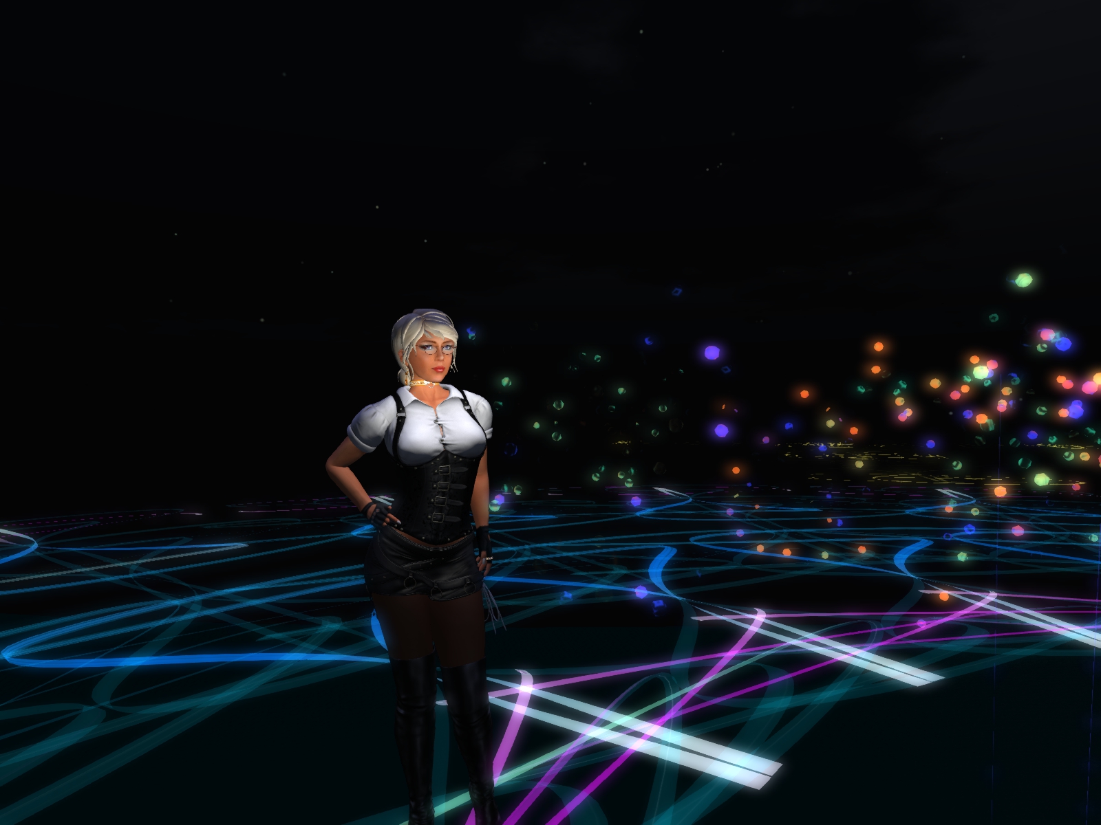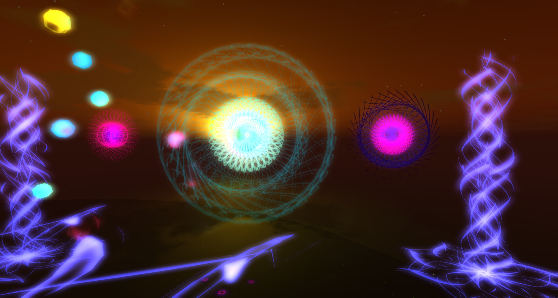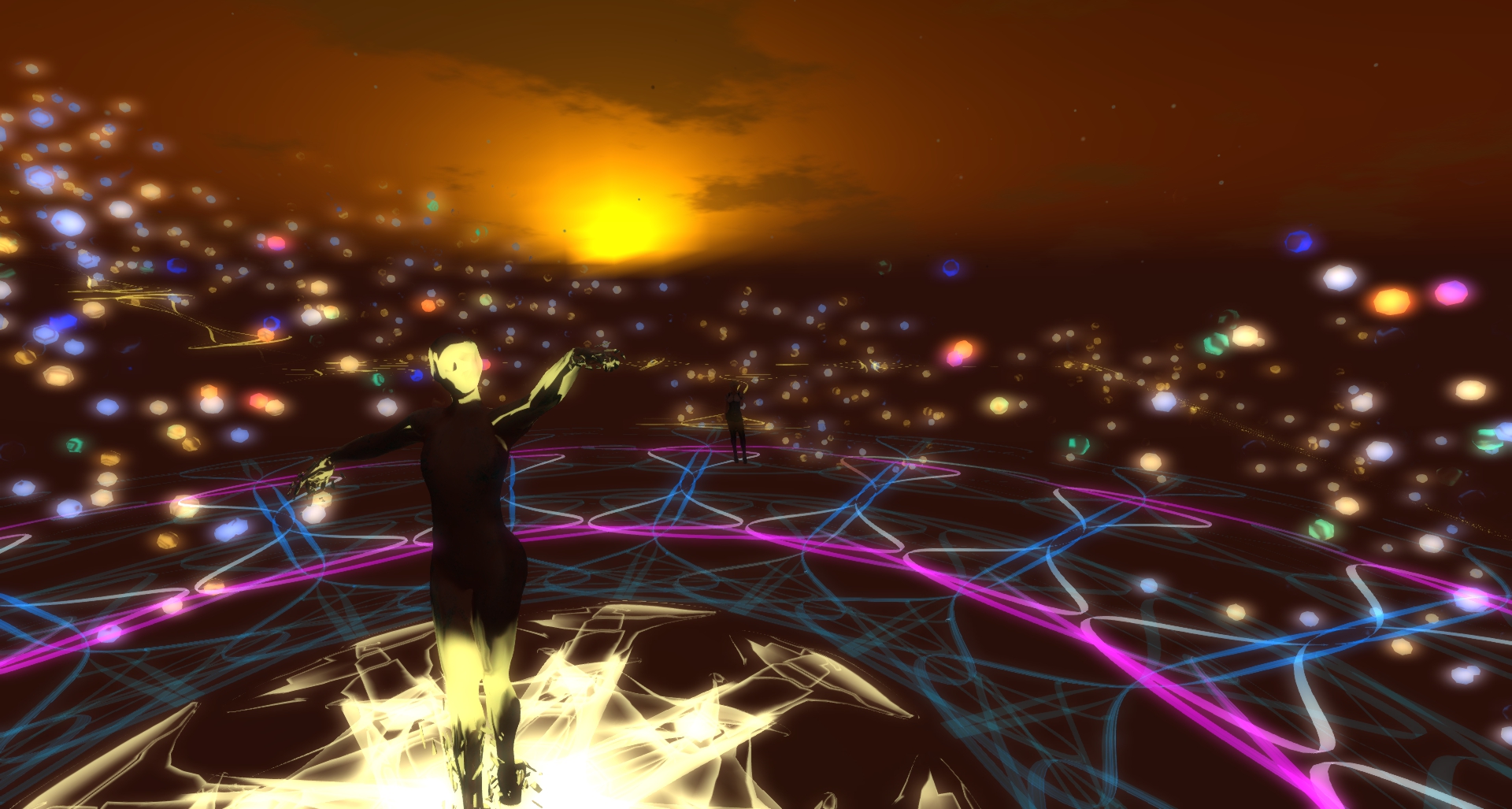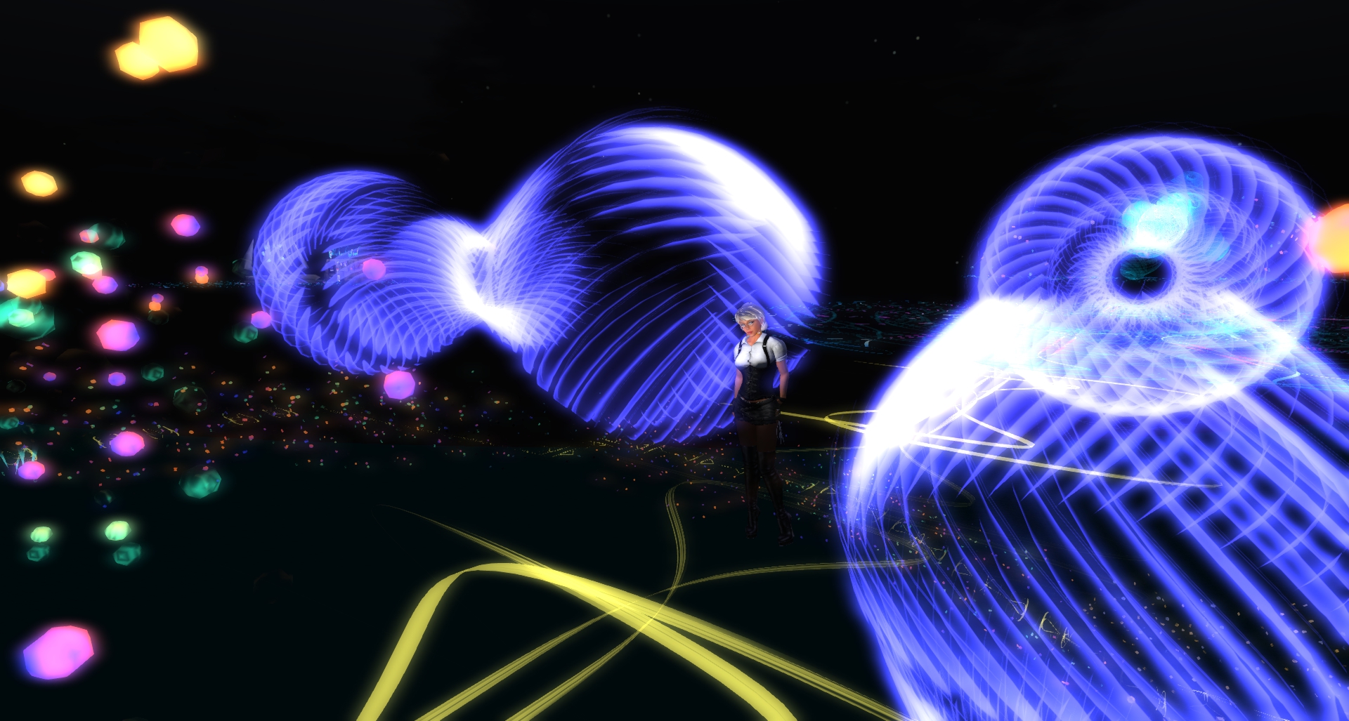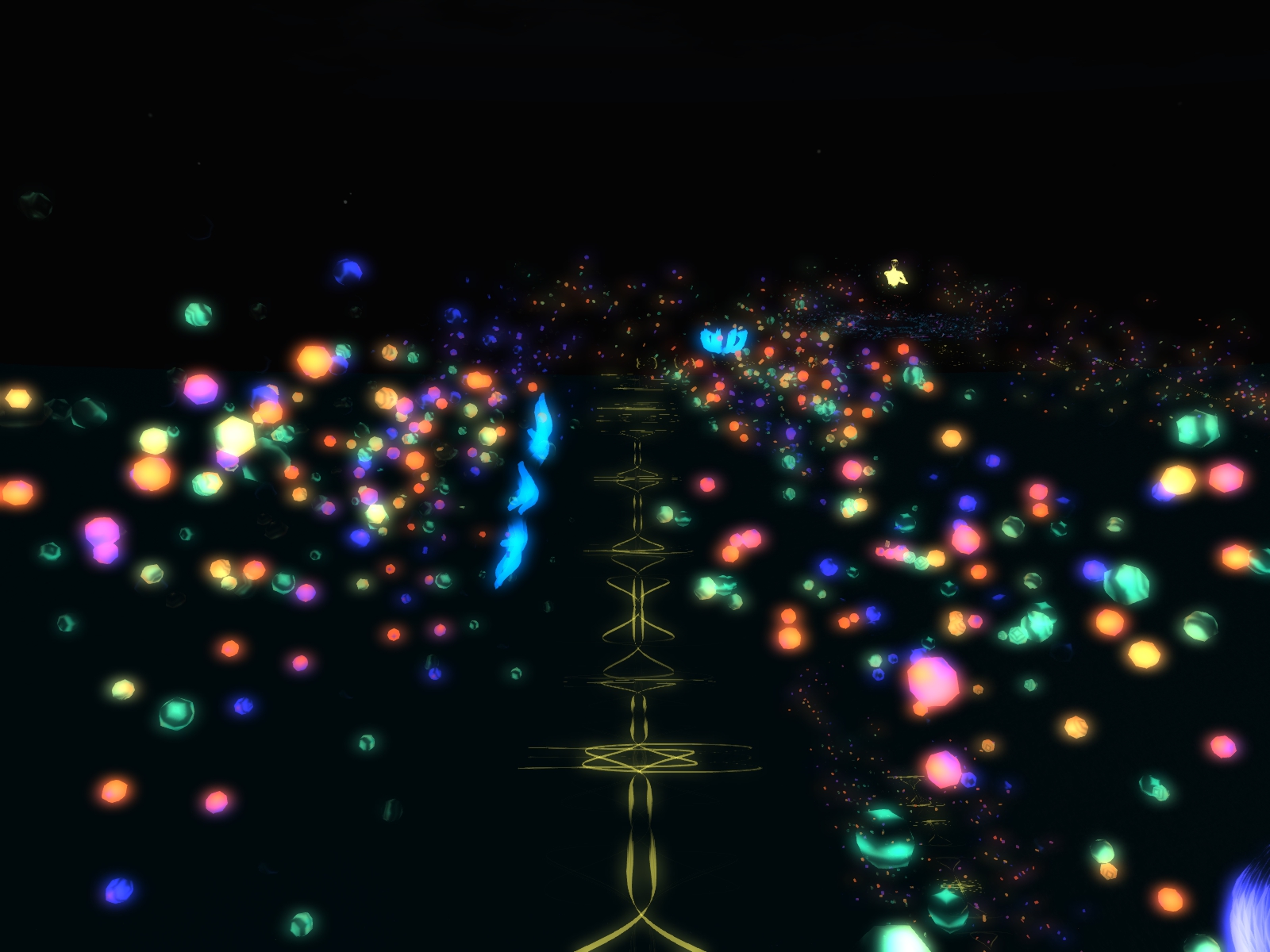 Upon your landing you are surrounded by light, by colours, by particles and it is that overwhelming that you loose orientation first, at least I lost it and fell down from the platform in the sky to the ground. I first thought ok, you have to explore flying then, so I began to fly upwards until I reached the next platform. Then I recognized that there are quite broad and lighted transparent walkways between the different also transparent platforms. Hence I walked over these ways traveling from one scenery to the next always getting new viewing angels, new bright hovering spirals, other blazing particles in all colours of the rainbow, new impressions.