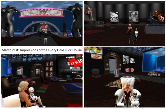 Tuesday night, March 21st, I went on another “kinkploring” tour with slave Flo. Starting point was again a landmark that I found in a profile while visiting a club. We visited the Glory Hole Fuck House. Let’s begin with the description: “Coming to the Glory Hole Fuck House will put you in danger of getting fucked! porn cinema, D/S, Dom, domme, femdom, glory hole, gangbang, cum slut, cock whore, sissy, ...”. Well with this description and this name I expected it to be a sordid place that is normally below my standard (am I opionated? Yes, I am), a place where I expect horny males, mostly newbies, just seeking pure sex. In short a place I won’t visit in RL.