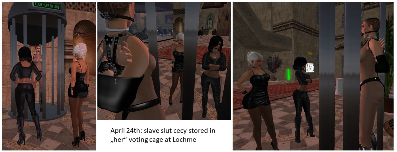 Our slut cecy returned from her vacation Sunday night. It took a while to get her used to us again and not to question commands but I think she’s back on the right way now. Therefor we rewarded her and stored her in the voting cage at Lochme Monday night before we went off to bed. That’s it for the blog right now.