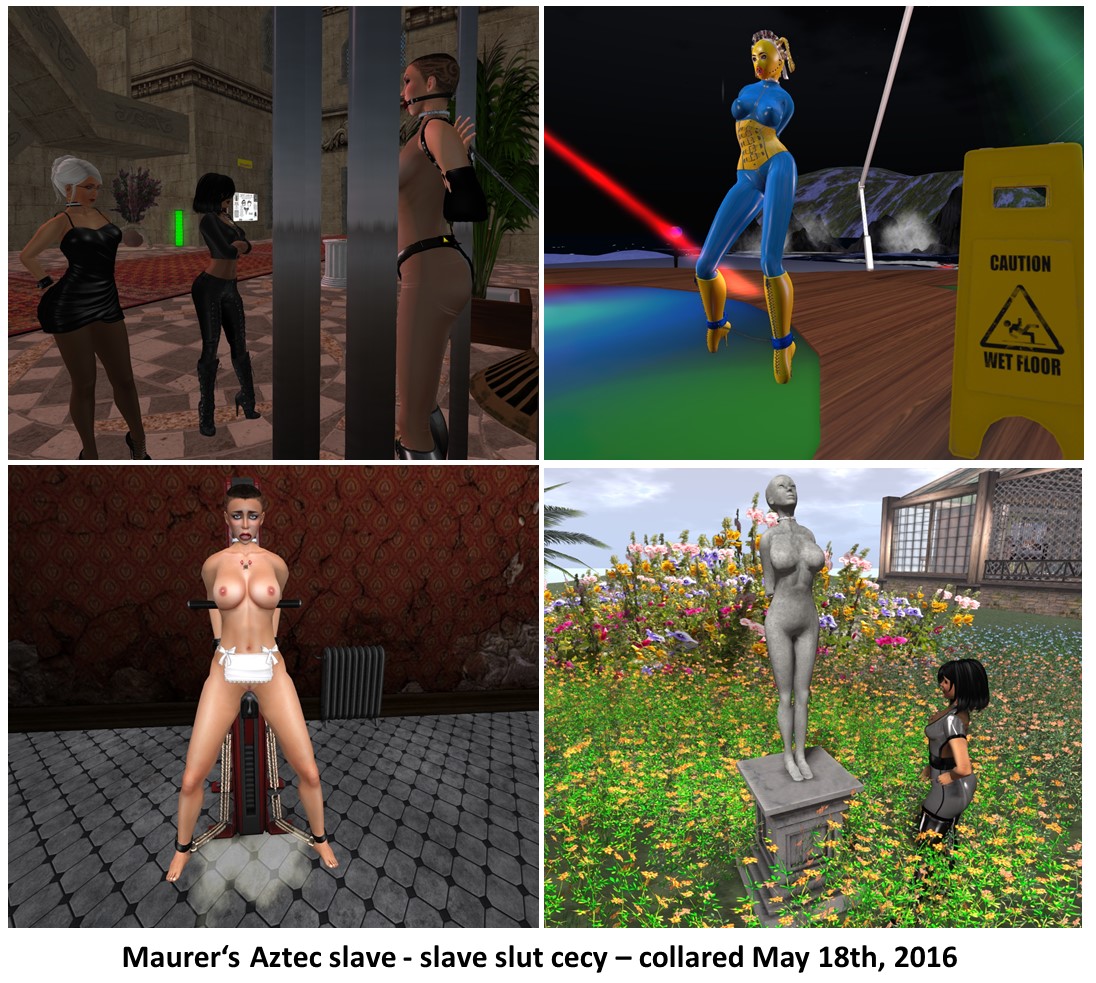 Today we’re celebrating slave Adarra’s and slave slut cecy’s one year collaring anniversary. The entry about the double collaring can be found here. We met slave cecy at Ropers and her first appearance in this blog dates back to September 2015 in “Enjoying bondage September 2015: At Roper’s playground“. Cecy is from Mexico and hence not really our timezone at all but nonetheless she manages to be online when we are. Cecy was for a very long time our blue and yellow living latex doll and she really loved this outfit. When we collared slave cecy, we didn’t have a slave name for her. Over the last year slave cecy has developed becoming more and more our slut. She’s always horny, often wet – drippin’ wet in Second Life. slut loves it to be humiliated and exposed and is always excited and willing to try anything new. We took a bit control over her RL, in particular regarding her orgasms. It’s so nice to have her begging for one. We have introduced Cecy to the voting cage at Lochme and she has impressed us with how quickly she can get Yes votes even when we handicap her or give her a high number to start from. In fact Cecy enjoys being exposed in any way we can think of. Slave cecy is very loyal and dedicated to us and is a good addition to our family. Today, slave cecy is mostly addressed with slut oder slave slut. Happy collaring anniversary, Maurer’s Aztec slave … oder shorter: slut!