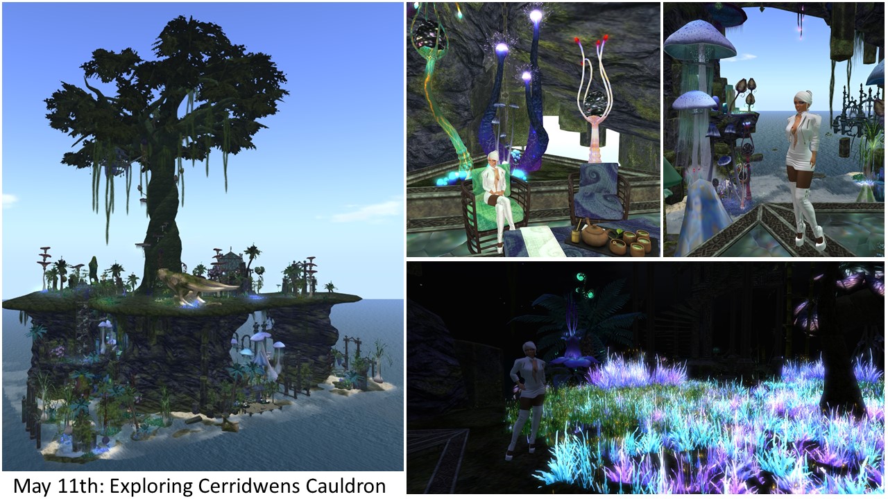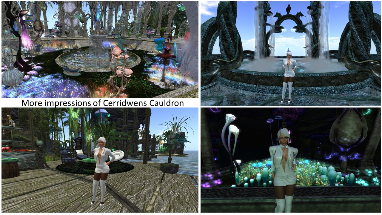 When I visited Enchanted Art on one of my latest simploring tours (read here) I came across Elicio Ember, who created the Botanical Garden, the main gallery and some other piece there. Elicio makes is a plastic artist and desginer and makes fantasy landscapes, plants, architecture and art. Elicio has an own sim and an own store, Cerridwens Cauldron, and invited me over to visit both. Thursday, May 11th, I visited Cerridwens Cauldron.