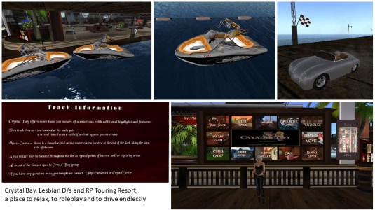 “We offer a D/s and RP themed destination to relax and enjoy your Second Life experience. Crystal Bay is an adult D/s and RP themed sim for women only. We feature over 700 meters high of winding, scenic endless mesh roads for you to ride and plenty of places to stop and explore, relax and play along your travels through Crystal Bay. We offer a sim wide MSM restraint system for Dommes and subs to enhance your D/s and RP experience.”