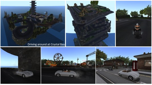 After my boat trip, I zoomed out to get an overview of Crystal Bay and I saw that it consists of several levels all connected by streets. The sim is a huge race track (700 meters high of winding, scenic endless mesh roads for you to ride). Quite close to the landing point you can rezz a free old Porsche and use it to further explore the sim. That’s what I did.