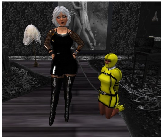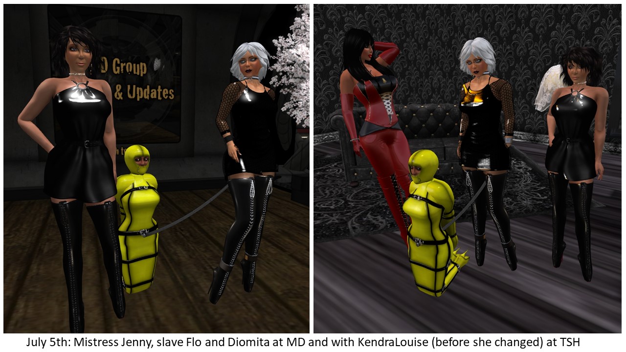 Wednesday, July 5th, we took slave Flo out in her new summer outfit to Mesmerize Dungeon and The Secret House. Particularly at The Secret House slave Flo got some attention really outstanding in her bright yellow restricting outfit. Argi was present and we had fun. Argi entertained the quiet crowed with chatting in main and teasing and talking not only to slave Flo, who – being gagged – couldn’t participate that much.