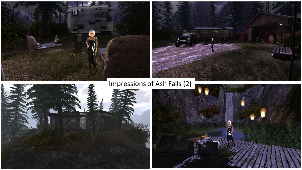 The windlight setting of Ash Falls (Bryn Oh’s Mayfly) is quite dark and enhances the intended atmosphere of it. Ash Falls is a volcano island, the ground and in particular the large beach is covered by dark volcano ash sand. The vegetation is dominated by large conifers. The landing point is at the North West end of the U-shaped island. Along your way discovering Ash Falls you will find quite a lot, hidden corners to sit and mediate or to cuddle as well as terraces with nice views. At the other end of the island is a residental, modern home that looks occupied and in use. What else you will find? There’s an old quarry, obviously not in use and semi-flooded lightened by floating laterns. Not far from the quarry is outdoor cinema. The projector is still running but you won’t see a movie, just shadows on the broken wall that was once used as a screen. The sound of the projector together with the dark light creates a strange morbide atmosphere. And not far from the cinema is an old shack and barn. The modern truck in front of the farm indicates that someone is still living there. And there’s the large beach. Quite close to the water is a shed that is used as a coffee house and offers seating in and outside.
