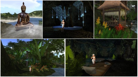Thursday, August 17th, I went simploring following Inara Pey’s blog post “Art in the wild in Second Life“. Aly’s Fine Art Gallery & Jungle is, no surprise, a sim owned by Aly (Alysheea) with a gallery showing Aly’s art and with a jungle. The sim was built by Prosperine2 and Hepburn30. In the landmark description it is described with the tags “fine art, sculptures, photographs. The sim contains: waterfalls, cliffs, caverns, caves, hidden discoveries, romance, relaxation, dancing, adventure, Buddha, elephants, nature, GREAT photo ops, ruins, beaches and more!“