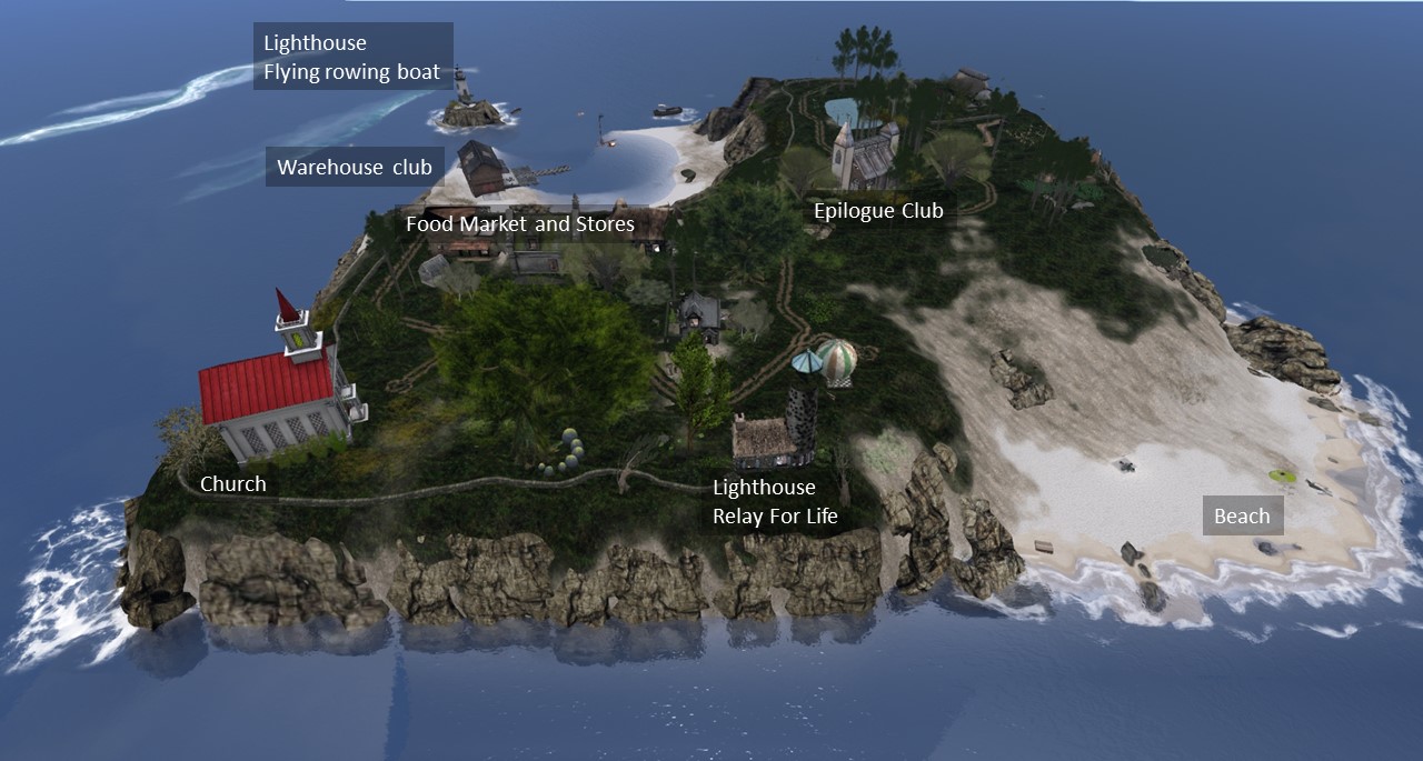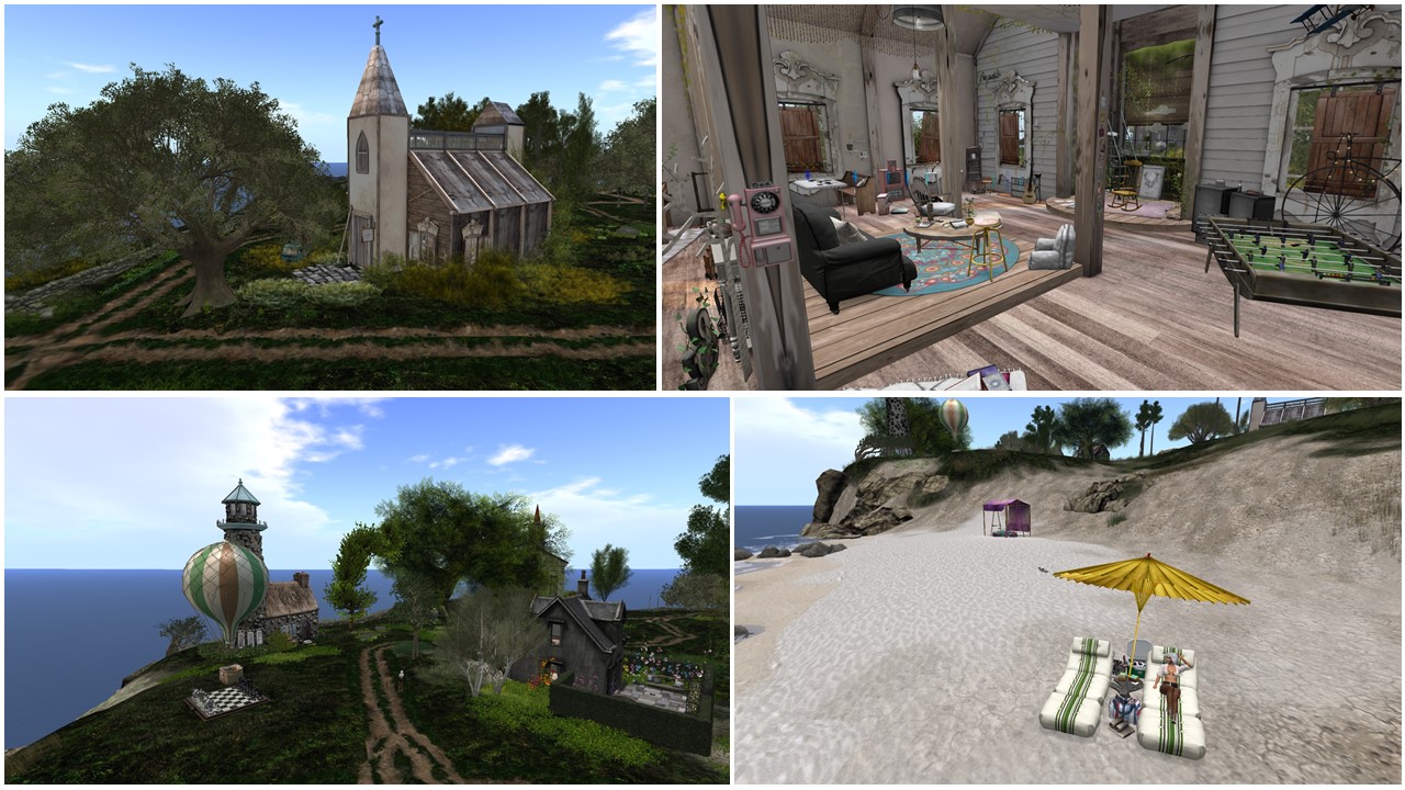 A bit further away you see a wooden building that looks like a church, but inside is a club called Epilogue, that is managed by Charlotte Ophelia Gilmore (charlottegilmore), as far as I understood, the SL daughter of Sunshine. Epilogue is “just a cozy place to hang out, have conversation and listen to music! They have occasional music events, open mic, book clubs, readings, and just sharing of their artistic endeavors.”