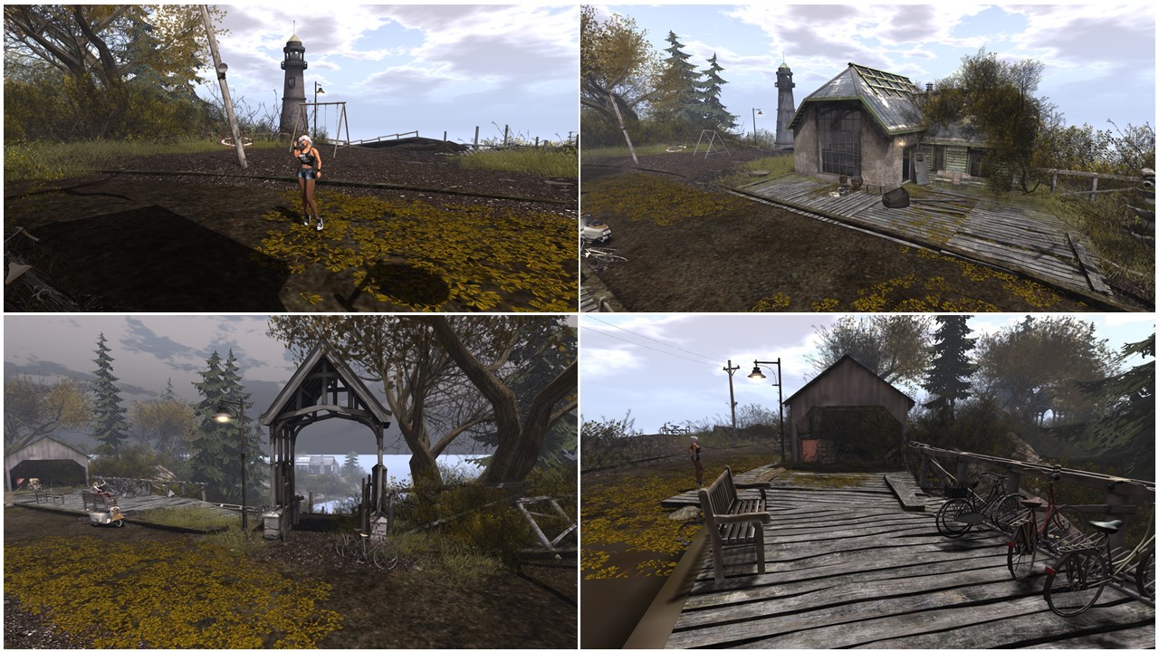 Arriving at the landing point in the middle of the main island and looking around you see a lovely autumn setting, bicycles, benches … and it looks inhabited. On the second view and taking a closer look, you see that the few buildings are abandonned, the nature is already taking the place back. The two buildings close to the landing are still full of stuff and furniture but the bushes and trees begin to grow even inside.