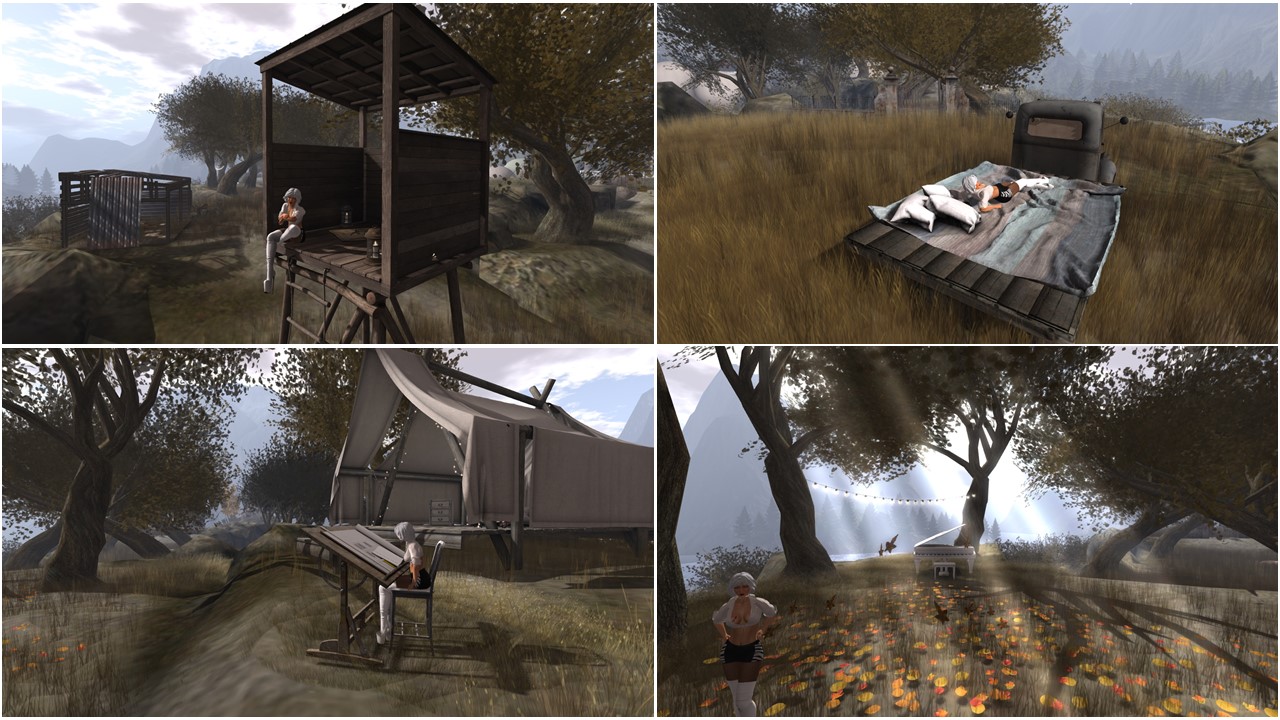 I decided for the Autumn part first and went up to the cliff. You have beautiful views from up there as Aspen Fell Memories is embedded in a perfect sim background. There are several places to sit and cuddle or to mediate. When you walk to the end of the cliff you come to the ruins of a farm – and it begins to rain. At one wall you find the inscription “The best thing about Memories is making them“. Just closeby is a nice and cosy tree house where you can warm up.