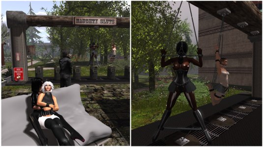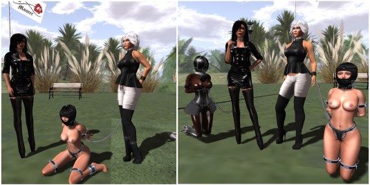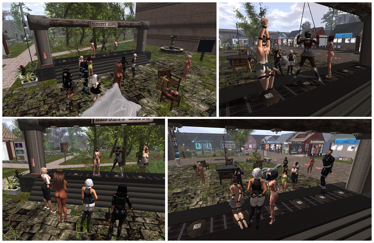 We spent Monday night at Lochme. I tied up slave slut cecy, slave Flo and slave kelly on the slut platform at Lochme. We had fun teasing them with the built-in toys of their chastity belts. slave Flo’s moans interfered with the noise of her breathing bag. slave slut cecy used Drath Vader as a new nickname for slave Flo before. Our three exposed slaves moaned together like a choir and of course slave slut cecy begged constantly for an orgasm RL and SL. Lochme is a busy and unfortunately also laggy place, reminding me a bit of Stonehaven. It didn’t take long and quite a crowd had gathered around the platform which added to Mistress Jenny’s and my fun.