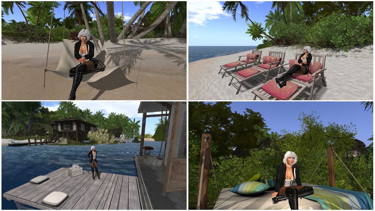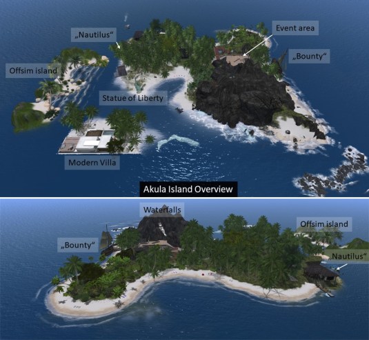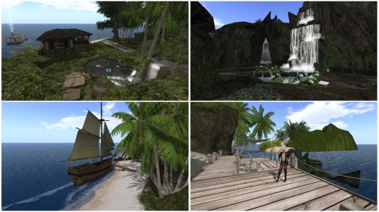 After my visit to Sunfall just a few weeks ago (read here) I got in contact to Freya Spellhunter, one of the owners of Sunfall. We had a very nice correspondence. She first pointed out that Sara Greene, the other owner of Sunfall, did most of the work in creating this sim and that the credits should go to her. She also told me, that there’s another sim in the immediate neighbourhood that I may not have noticed. It’s a tropical retreat, created and owned by Sara Greene and it is open to the public – Akula Island.