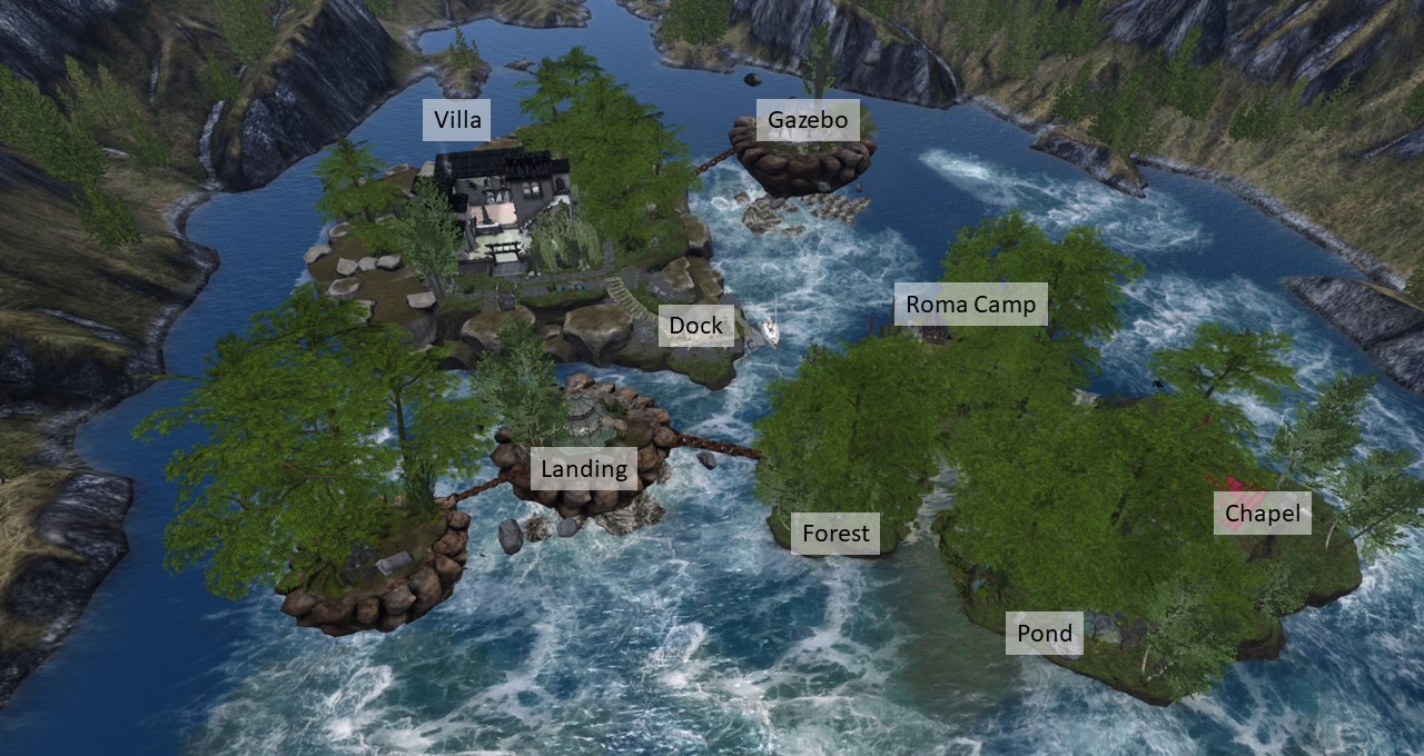 Instead of walking you can use the sim’s teleport system. In the overview above I added the teleport spots for your orientation. On the main island, which has a Mediterrean touch, is a large villa and a bit below of it a nice decking with a fireplace. The decking is just next to a small jetty with a sailboat.