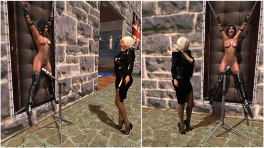 At our skybox I had prepared a little surprise. I fixed Jenny at an quite old bondage rack and used a tripod with a mounted vibrator dildo to arouse her. I got this litte but effective toy just a few weeks ago from Mitchen Heston and hid it from Jenny up until today. Nothing beats a moaning owned Mistress *winks*. With these activities our afternoon flew by.