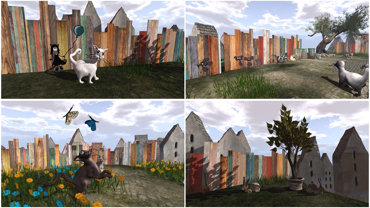 Cica’s cats live on a meagre rocky and almost round island. In the middle of the island is a plateau which is surrounded by a village consisting just of many similar houses. The village looks dead and not inhabited. There’s just one path, that leads from the landing point at one corner of the island to the green hill with the plateau in the center. No other paths, no shops, no trees, almost no vegetation.