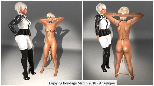 This month’s enjoying bondage picture is particular in many ways. First of all, I had in mind already that it shouldn’t be a collage but should just be Angelique and me in a bondage and spanking scene. Then, when I came inworld Wednesday, March 7th, in the afternoon for a bit of simploring, Angelique was also inworld unexpectedly and she called me to have a look at a pair of nipple clamps. She has some already, but she and I were not happy with them as they are static, they are attached to her avatar body but when she walks they don’t stay attached to her nipples. Now she found some that are not static. I joined her at the store and after looking at a demo version, we got not only these nipple clamps for her, but also labia clamps, weights, cuffs, chains, an anal hook and a spreader bar.