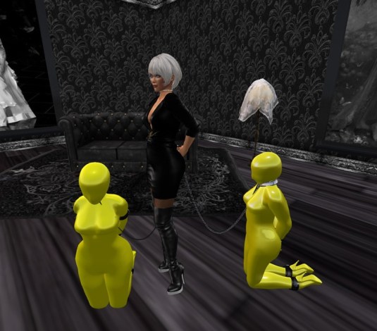 The Secret Society Embassy is housed in a Second Life premium member home and owned by Anastasia (manastasiap). It is just the same type of house that I own and that we call our loft. But you can also make something really kinky of such a house. All inside walls were covered with black latex curtains and on the 1st floor are also some toys and gear, clearly related to rubber fetishists.