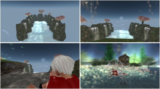 “Paradiso” is a paradies for taking pictures. The aurora borealis makes a perfect background and the colours provided by the sim windlight are just beautiful. You will find some ruins and on the island in the middle of the sim it is raining. You will also find some really nice spots to sit and cuddle or to sit and dream or mediate. It is just a beautiful place. If the paradies is like that, I’m not afraid of it *winks*.