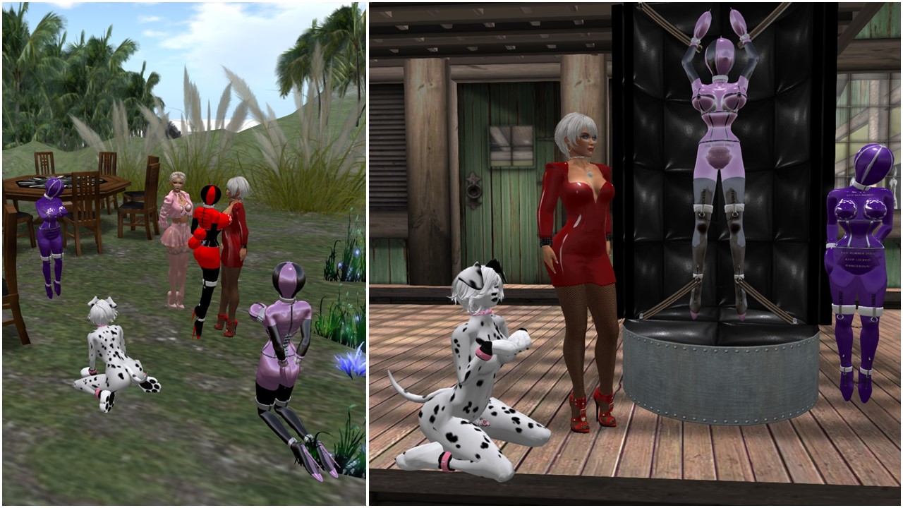 June 7th – at the game area at home (left picture from left to right: slave Flo, mutt (relaias.sewell), Angelique, dani Sheryffe, Dio, AnneWanne) / on the porch of our house (right picture, from left to right: mutt (relaias.sewell), Diomita, AnneWanne, slave Flo)