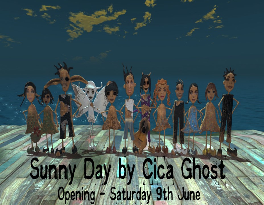 Today, Saturday June 9th, I got an invitation from Cica Ghost to visit “Sunny Day“, her newest installation. I followed the invitation right ahead. The landing point is on a small rock that is connected by a bridge with the main island. The first view on “Sunny Day” is already lovely, you see several suns shining from a bright blue sky, moving flowers and the typical Cica-houses. “Sunny Day” is like from another world, it has something of a childlike phantasy world, a toy world, peaceful and beautiful.