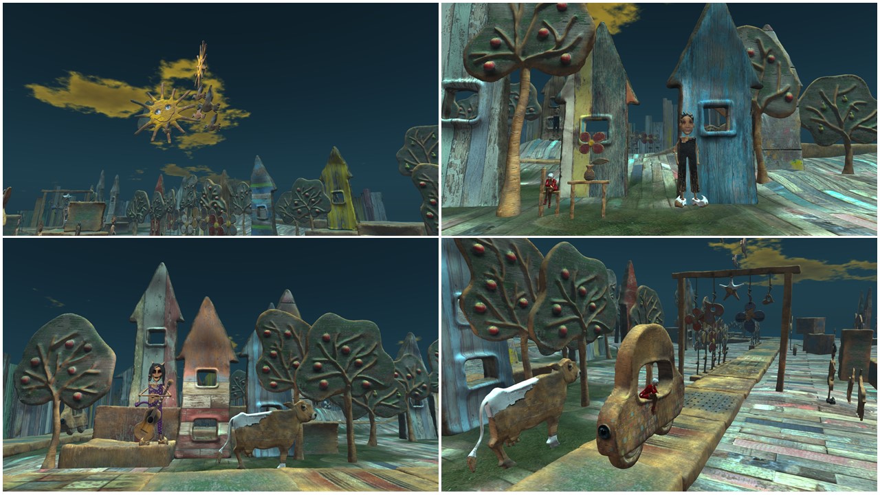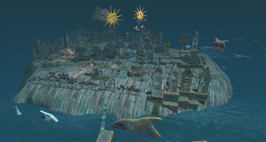 Between you and “Sunny Day” is the bridge which is guarded by two monster fishes with intimidating teeth. But no worries, they don’t bite. On the island you can discover a lot of nice details. The ground is made of wooden plankes. The houses, the flowers, the tree and the persons can easily be recognized as Cica’s work. A road leads around the village in a circle and there’s one car driving. You can hop on the car and make a circle tour around the island.