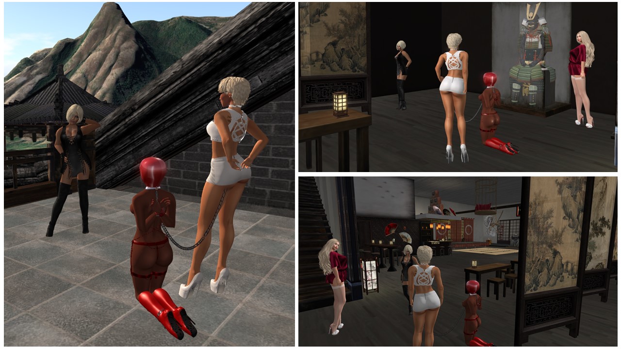 I chatted with kitty and she lured me to Japanese style home, where she was at that moment. She had read profiles standing around at Heavy Bondage Club and this landmark was just the last one she visited. She was welcomed there. I summoned slave Flo and after saying hello we had a look around, Next to where we met Kitty was a gallery showing pictures of various residents.