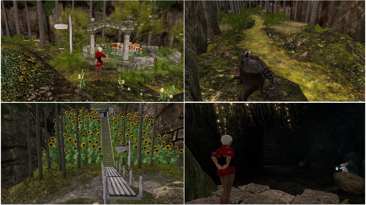 I began my simploring at the beach from where you have to walk up a bit to get to an indoor swimming pool. There is a set table for a romantic dinner for two. From there I walked through the woods upwards and upwards. Along the path you might notice some animals who liven up the scene. At one point you can leave the path and enter a sunflower field, which I did not as I assumed that it was already on the next parcel. Later I found out, that it is an extension parcel of “Peace of Mind“.