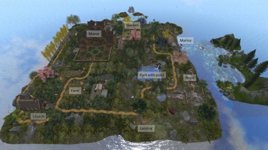 After some walking I reached a bay with a sailing boat anchored there. At the shore is a small shipyard for smaller boats. After staying there for a bit I continued my tour, I passed several nice places to sit and cuddle or to simply enjoy. Then I passed some ruins and saw a dandelion which you can use to make a tour flying over the island. I didn’t do that though. After passing the ruins I came to a park with a pond, another place just to enjoy. There’s also the possiblity to dance. Shortly after the park with the pond I reached the landing point once again.
