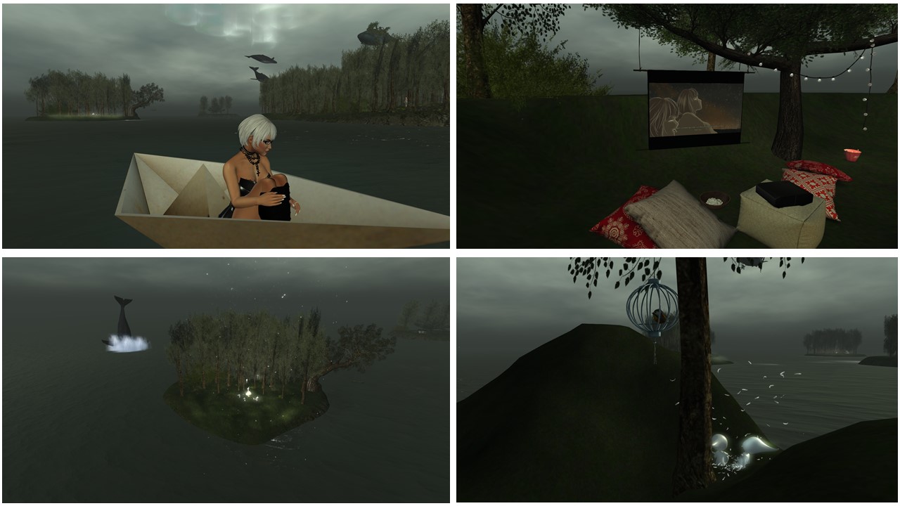 The landing at “Sea Monsters” is at a wooden pier. You see another small island not far away from the pier, the secenery is mystic (I kept the proposed windlight settings for my visit), a white glowing small being is next to you, a whale jumps out of the water nearby and hides again in the sea, you hear some kids talking or singing but can’t understand it, there’re white particles hoovering in the air and soon you’re caught in this fantasy world.