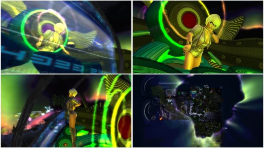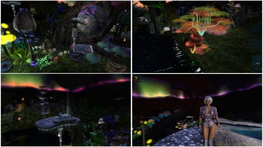 In the center of Happy Clam Island is a venue called Organica. That’s where you land follwing the provided link. The first impression was – wow! It’s been a while that I saw something that colourful. It’s pure fantasy and it is beautiful, it’s art made of pixels and light effect. Always changing, no single view is like the other. An aurora borealis dives the place in different colours continuously. I went to “Heartseed of Organica” where you find a colourful stage. I assume that is where the dj’s perform.