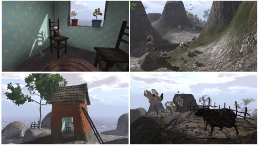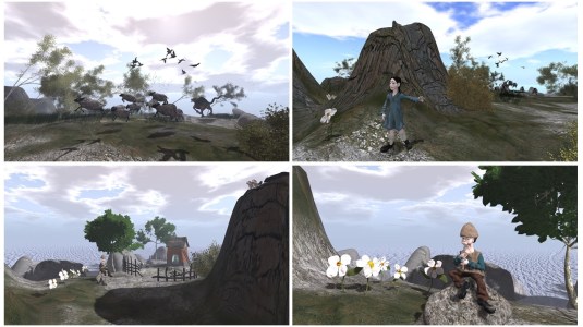 Cica has developed her very own style and the girl and the boy look very “Cica-ish”. I wouldn’t have recognized the sheep and the wolf as her work at the first glance though. The flowers, that are spread over the sim, are those Cica already used in her installation Bees and Bears (read here) And you will find again one of Cica’s 50 cats (read here), it sits on the roof of the house. Like in many of her installations before humans are really short compared to everything else. This way you experience an other point of view, maybe more respectfully.