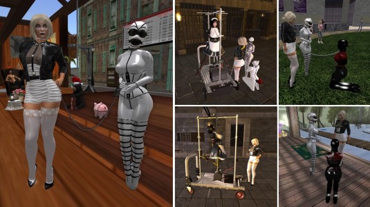 December 9th – a varied afternoon: Diomita with slave Flo at Puerto Esclava (left) / at Psi’s realm testing the slut punishment cart (middle) / at Heavy Bondage Club and at home taking control of slave doll