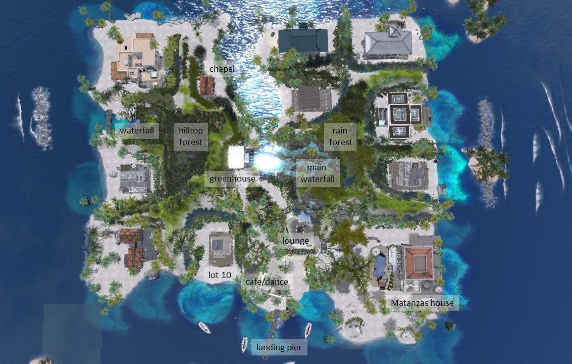 “Mantanzas is created as a tropical island with only a few rental homes to cover tier. Most of the island is wild and uninhabited. Theres 3 (custom made) waterfalls, 2 forests, one which is a rain forest and several ‘public’ buildings, one is the island greenhouse thats decorated every Halloween and Christmas. Theres an old Spanish Chapel from when the island was a colonial sugar plantation. Some houses are remnants of the Spanish, others are newer owned by the ex pats that live here.”