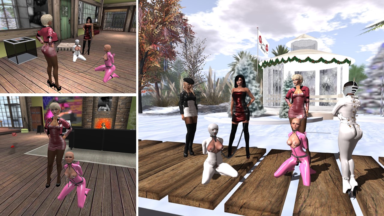January 2nd: Angelique, slave Gwen, Mistress Jenny, slave Flo, slave kelly and Diomita at Psi’s realm (left and upper right) / slave kelly the cage on the porch of our house at home waiting for being (ab)used (lower right)