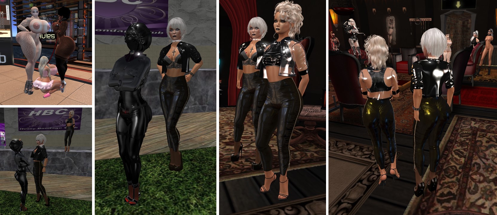 February 24th: Freaks at club Domme a Domme (upper left) / Diomita with slave Flo and Angelique at Heavy Bondage Club (lower left and 2nd from left) / Angelique and Diomita at club DeLust wearing the new pants