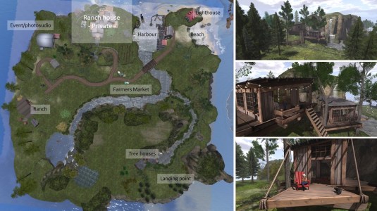 The landing point is in the East of the island just close to 2 houses, that are nested into a steep rock and supported by trees. I climbed up and enjoyed the view from up there to get a first impression about Green Acres. I was greeted by a visitor bot: “Welcome to the Green Acres sim. Feel free to explore and enjoy the many amenities throughout Green Acres. We only ask you to respect the privacy of the ranch house.”
