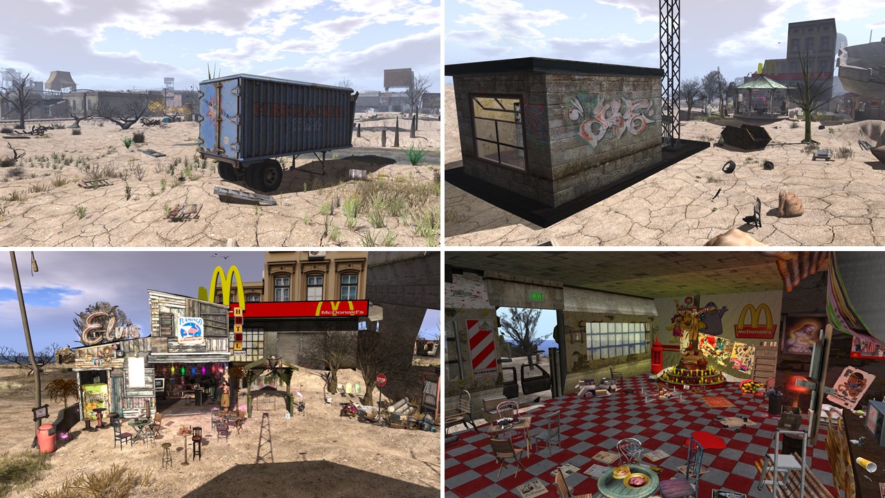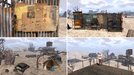 “In our parched deserts, rocky expanses, and rank swamps, you’ll find beautifully ruined buildings, precarious shacks, and mysterious assemblages of abandoned material, most of it created by the people who live here. From hidden underground bunkers to teetering swamp huts on stilts, from burnt-out vehicles to nomad’s tents, from helicopter concert stages to trap-ridden combat pits to ball courts to trade posts to working drive-in movie theaters, The Wastelands is filled with creative, detailed constructions.”