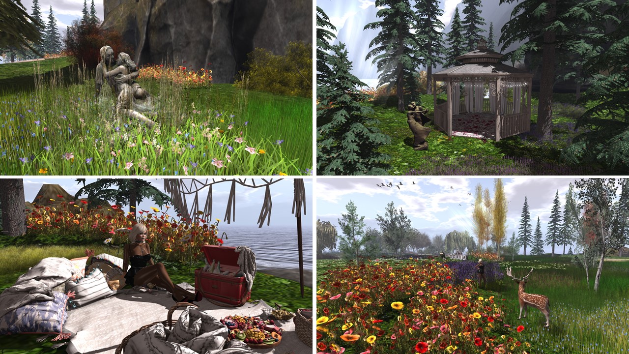 Sofia is first of all a sim to enjoy the nature. There’re many flowerbeds and nature seemingly explodes to life. Birds circle steadily over the sim. You can find rabbits, horses and deers peacefully grazing. Sometimes you see a trail like the one leading to a bridge. This trail is lined with lavender, lovely! Along the pond you find several places to sit and relax or to cuddle with your loved one.