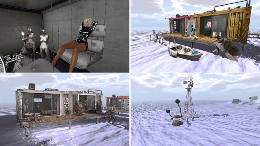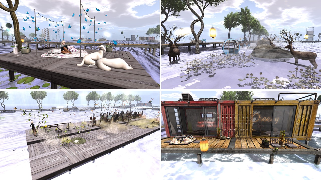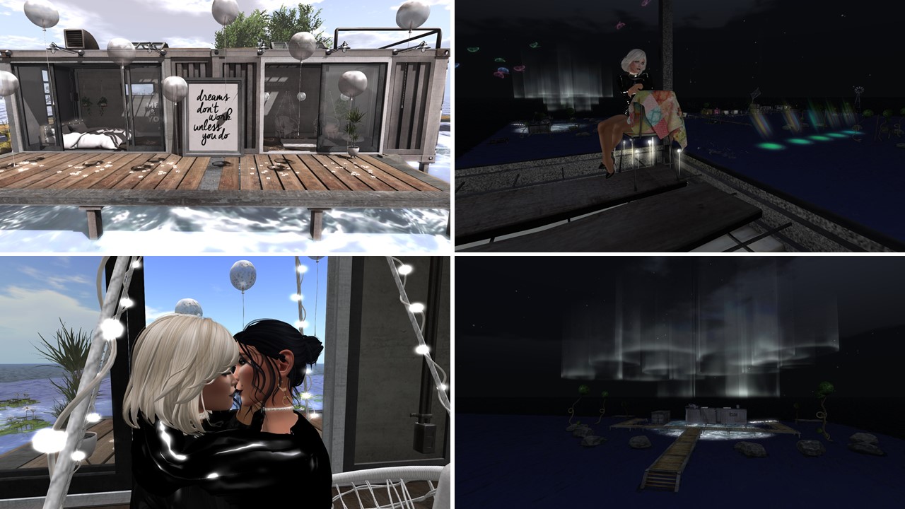 From the landing point you can choose to turn left or right to reach the wooden paths that will allow you exploring Black Kite on dry foot. But inbetween you have to walk through water. Besides the store there are containers along the wooden paths. Most of them are artfully and stylish decorated hideaways offering seats, chairs and beds with single and couple and adult animations. There’s a lot to discover, pieces of art and artful decorations and lights are spread all over the sim.