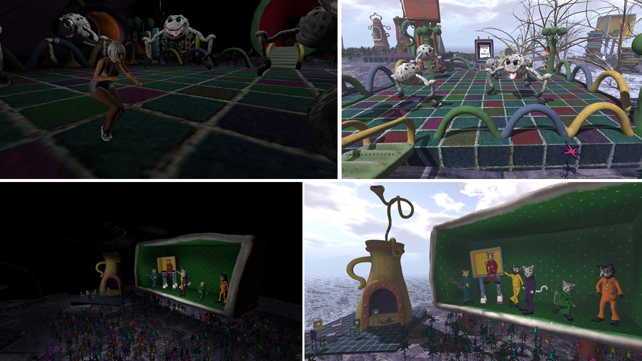 “Adults are only kids grown up, anyway. (Walt Disney)” is the quote Cica gives us on our way exploring the Luna Park. I do like this quote a lot, in particular for Cica’s creations. Her Luna Park is again full of little details to discover. On the landing point some large coloured rings dropped on my head from a pipe and I had to move away quickly (thus making room for new visitors). As usual I made a zoom out picture to get a bird’s eye view on Luna Park. In the center is a place to dance. The place is filled with 4 quite giant beings that look a bit scary first, but then when you join their dancing it is really fun and you laugh and smile (I did at least).