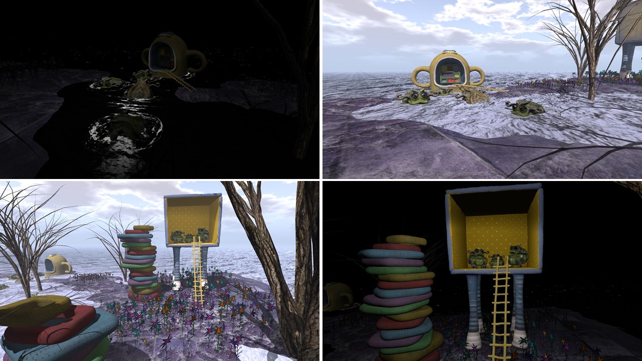 You might recognize Cica’s frogs in a corner of Luna Park. They seem to have found a new home. A set of “houses” are placed in another corner of the park. The houses look like flutes. An animal that I had not seen before in any of Cica’s worlds is the crocodile. One lives by the “houses”, another is swimming in the sea close to the landing point, right next to a ship.