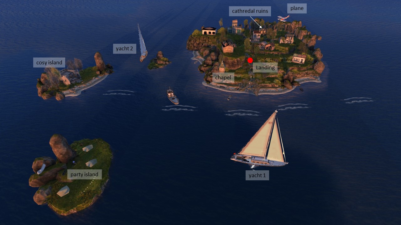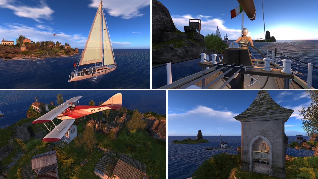 In the sea nearby The Island That Is Not There two yachts are sailing along the shores. You can easily get on board (just hoover your mouse above them and sit) and take some extraordinairy pictures or you can also just sit on the deck and enjoy the atmosphere. Also quite unusal is the plane flying over The Island That Is Not There. It does not move but you can get on board of it as well and take a selfie pretending you were flying it. i had fun doing so.