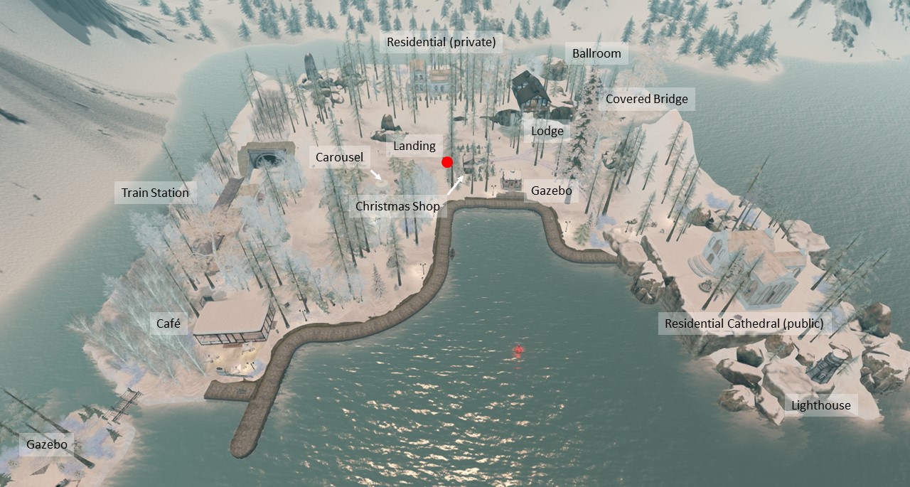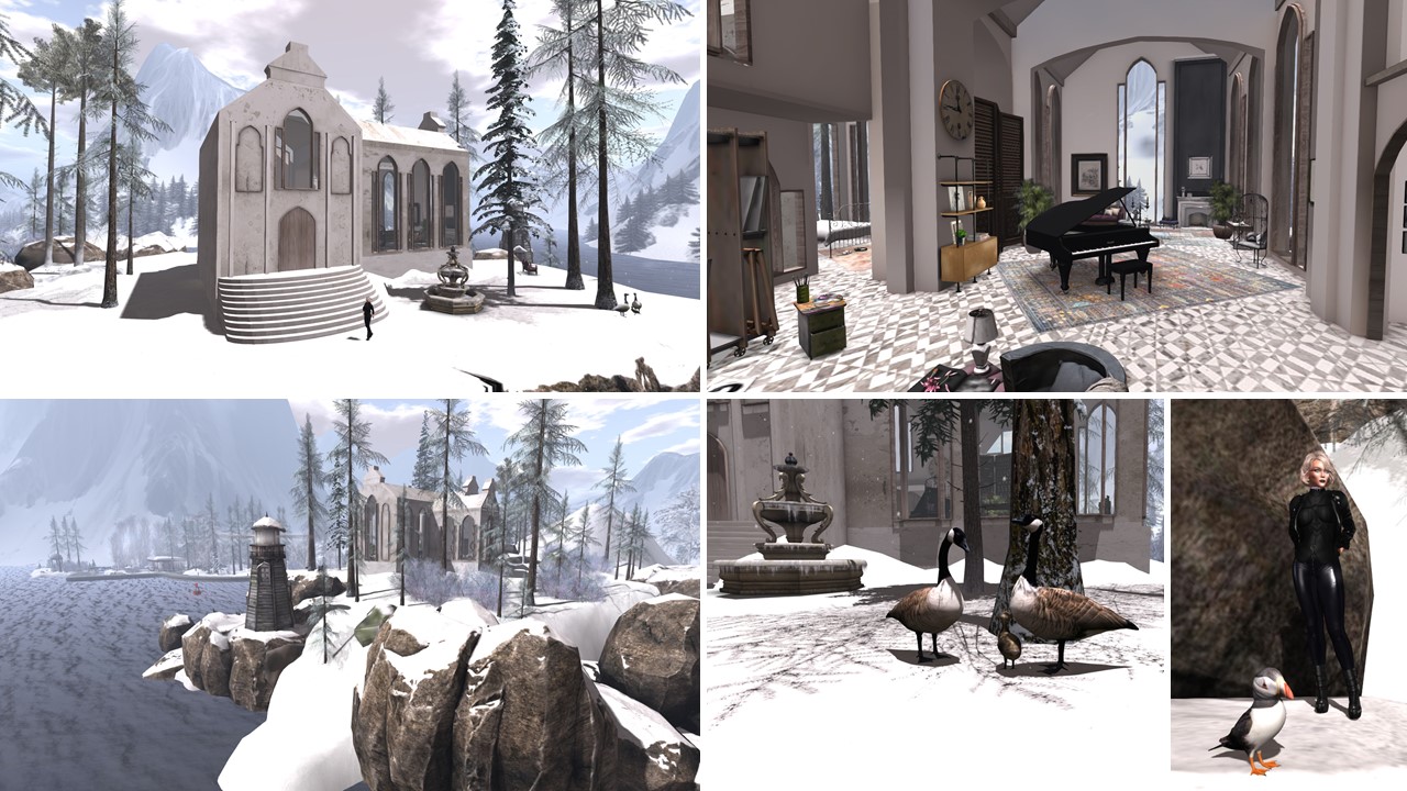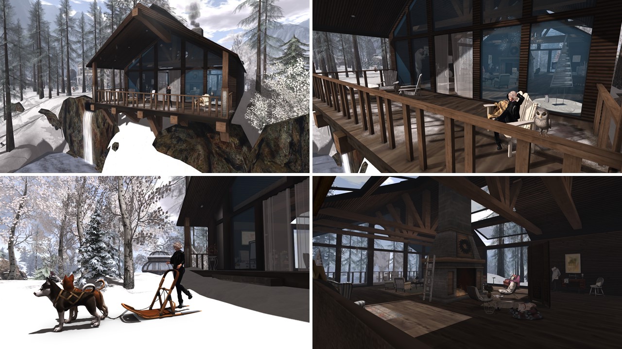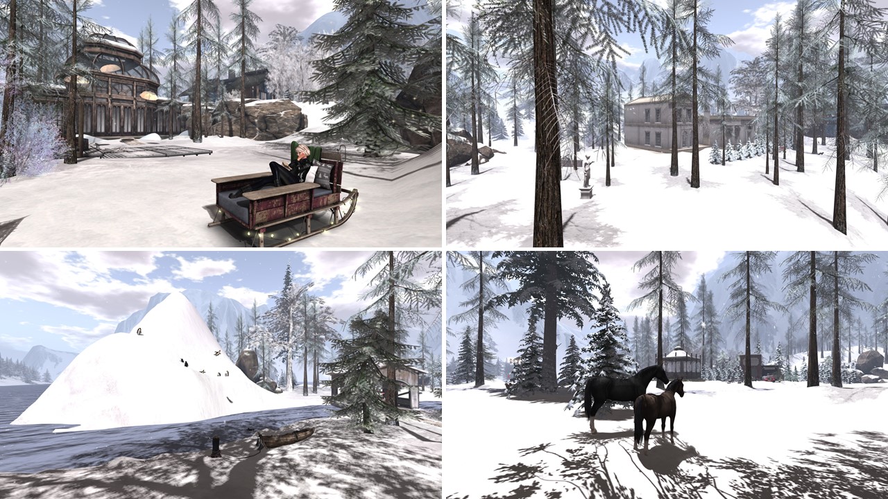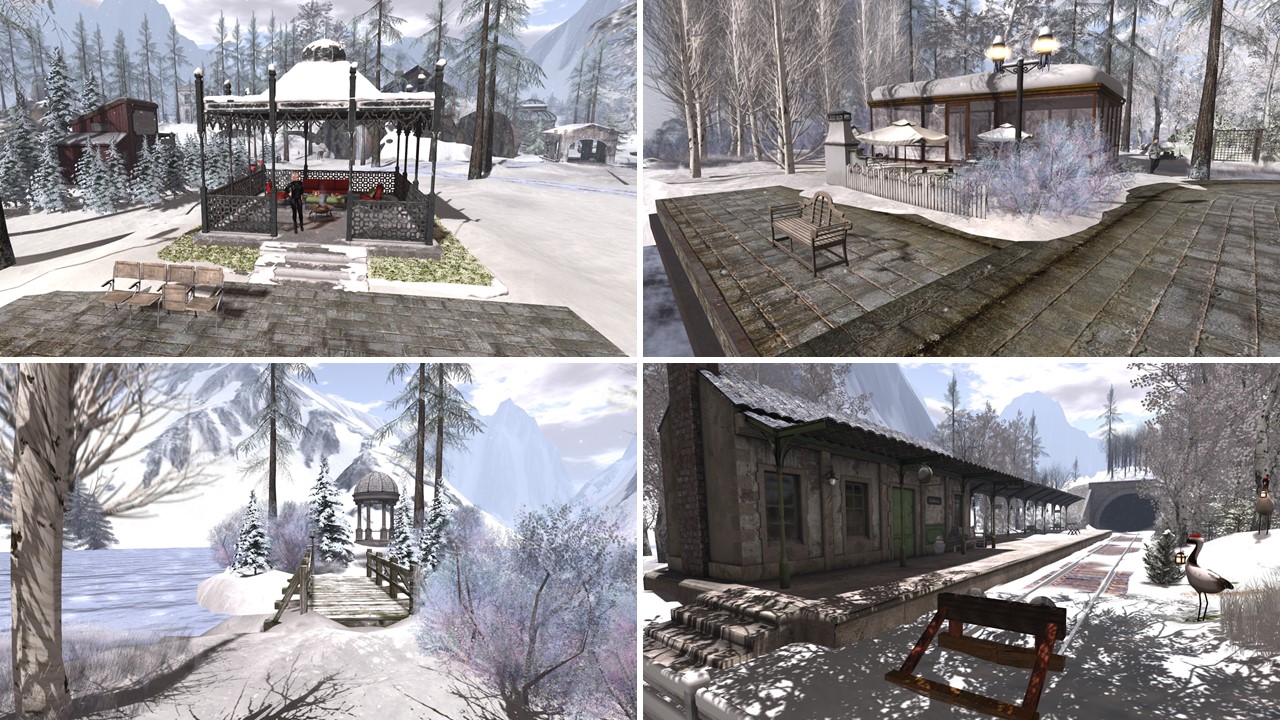 Winter’s Hollow is a moderate homestead owned and designed by Stella Mahogany. It is one of these wonderful Winter dreamlands, just beautiful and perfect for taking pictures. The island has the shape of an horseshoe and is embedded perfectly in a winter sim surround. The landing point is almost in the center close to to Christmas shop and a nice gazebo overlooking the bay. Along the shore is a nice promenade. I walked along this promenade until I reached a modern café and restaurant with large windows to enjoy the view. Nearby you can walk over a wooden footbridge to a romantic gazebo on a small island. Close to the cafe is a train station, which provides another great motif for taking pictures.