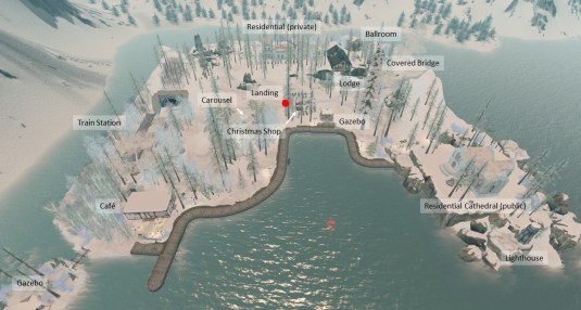 Winter’s Hollow – the gazebo by the shore, the café, the romantic gazebo on the small Island, the train station