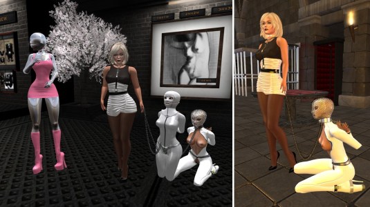 I went to the house with slave gwendi and summoned the sub. Her name is Rio (riolamour). I took control and restricted her and gave her some simple rules to follow. Then I cared about slave Gwendi. A few weeks ago Mistress and I had asked the slaves to tell us their two favourite outfits. I unlocked slave Gwendi’s head cage and took it off. For the next days slave Gwendi will wear just the vixen set and a harness blindfold gag and she has to find something appropriate to wear with it. When slsave Flo joined us, I also unlocked her and ordered her to wear her gord suit. Ann had joined us in the meanwhile and stayed with us for half an hour. After I was done with changing the slaves I took them all to Mesmerize Dungeon.