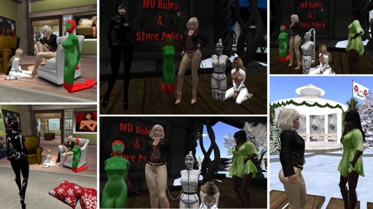 December 8th: Mistress Jenny and Diomita at home (left), at club Domme a Domme (middle) and at Heavy Bondage Club (upper right) / an old acquaintance of Diomita kneeling for another domme at club Domme a Domme (upper right) / Mistress Jenny and Diomita with sappy at the sandbox Mage
